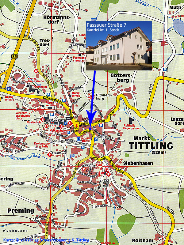 Zellner & Wernicke Passauer Straße 7 / I. Stock (Eingang Rückseite) Postfach 10 45 E-Mail-Adressen der einzelnen Anwälte: Besprechungstermine grundsätzlich nur nach Vereinbarung! In Einzelfällen kann von den oben genannten Bürozeiten abgewichen werden. Bitte achten Sie auf die Ansagen des Anrufbeantworters und die Mitteilungen unter der Rubrik "Aktuelles". Unser Standort im Ortsplan von Tittling: